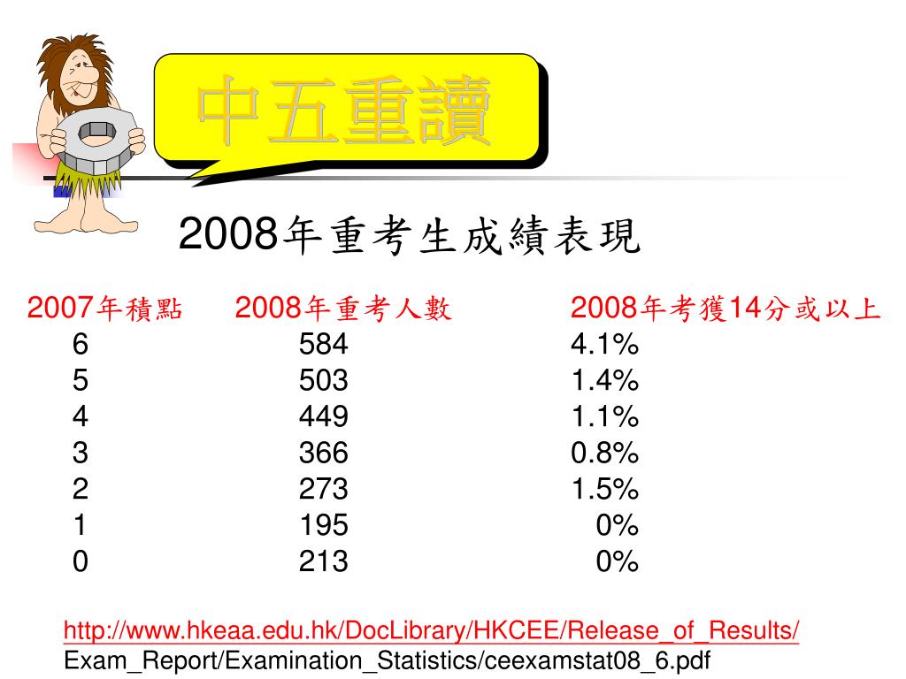 2007年積點 2008年重考人數 2008年考獲14分或以上 6 584 4.1% 5 503 1.4% 4 449 1.1% 3 366 0.8% 2 273 1.5% 1 195 0% 0 213 0% 中五重讀 2008年重考生成績表現 http://www.hkeaa.edu.hk/DocLibrary/HKCEE/Release_of_Results/ Exam_Report/Examination_Statistics/ceexamstat08_6.pdf