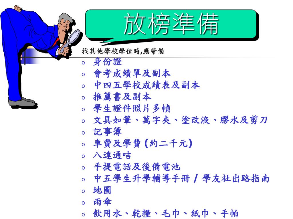 放榜準備 找其他學校學位時,應帶備 • 身份證 • 會考成績單及副本 • 中四五學校成績表及副本 • 推薦書及副本 • 學生證件照片多幀 • 文具如筆、萬字夾、塗改液、膠水及剪刀 • 記事簿 • 車費及學費 (約二千元) • 八達通咭 • 手提電話及後備電池 • 中五學生升學輔導手冊 / 學友社出路指南 • 地圖 • 雨傘 • 飲用水、乾糧、毛巾、紙巾、手帕