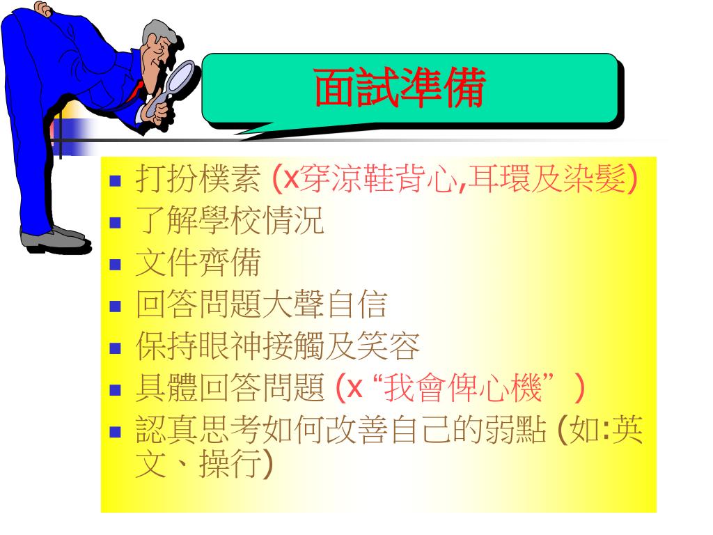 打扮樸素 (x穿涼鞋背心,耳環及染髮) 了解學校情況 文件齊備 回答問題大聲自信 保持眼神接觸及笑容 具體回答問題 (x “我會俾心機”) 認真思考如何改善自己的弱點 (如:英文、操行) 面試準備
