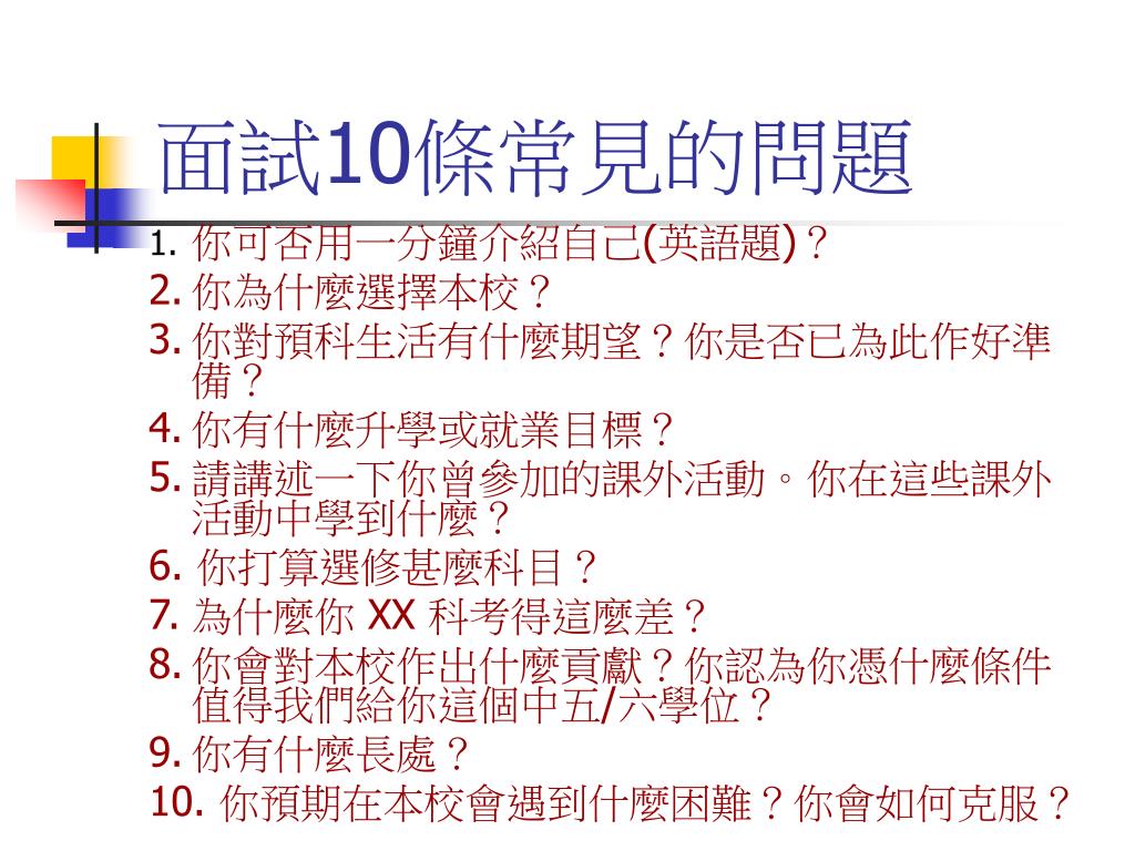 面試10條常見的問題 1. 你可否用一分鐘介紹自己(英語題)? 2. 你為什麼選擇本校? 3. 你對預科生活有什麼期望?你是否已為此作好準備? 4. 你有什麼升學或就業目標? 5. 請講述一下你曾參加的課外活動。你在這些課外活動中學到什麼? 6. 你打算選修甚麼科目? 7. 為什麼你 XX 科考得這麼差? 8. 你會對本校作出什麼貢獻?你認為你憑什麼條件值得我們給你這個中五/六學位? 9. 你有什麼長處? 10. 你預期在本校會遇到什麼困難?你會如何克服?