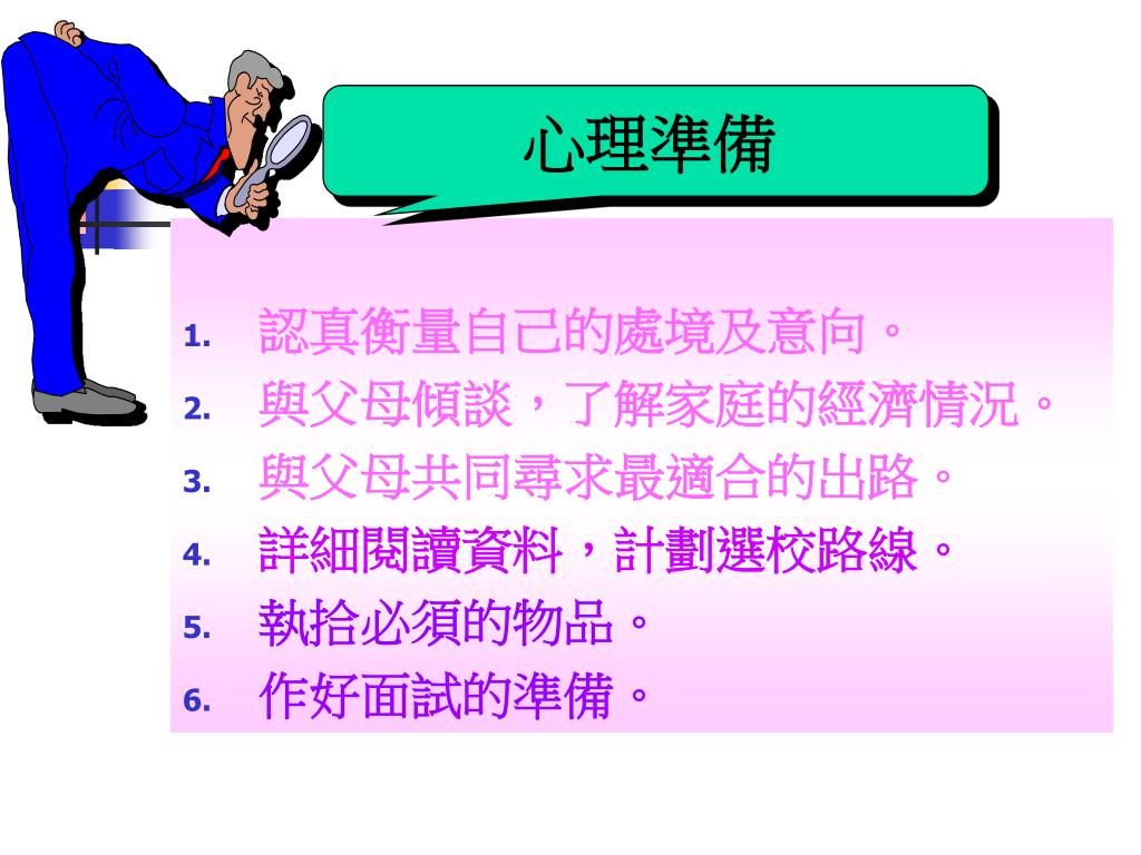 心理準備 • 認真衡量自己的處境及意向。 • 與父母傾談,了解家庭的經濟情況。 • 與父母共同尋求最適合的出路。 • 詳細閱讀資料,計劃選校路線。 • 執拾必須的物品。 • 作好面試的準備。