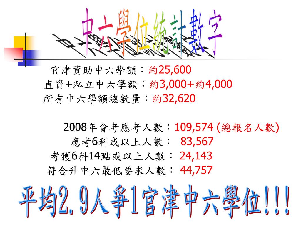 官津資助中六學額:約25,600 直資+私立中六學額:約3,000+約4,000 所有中六學額總數量:約32,620 2008年會考應考人數:109,574 (總報名人數) 應考6科或以上人數: 83,567 考獲6科14點或以上人數: 24,143 符合升中六最低要求人數: 44,757 中六學位統計數字 平均2.9人爭1官津中六學位!!!