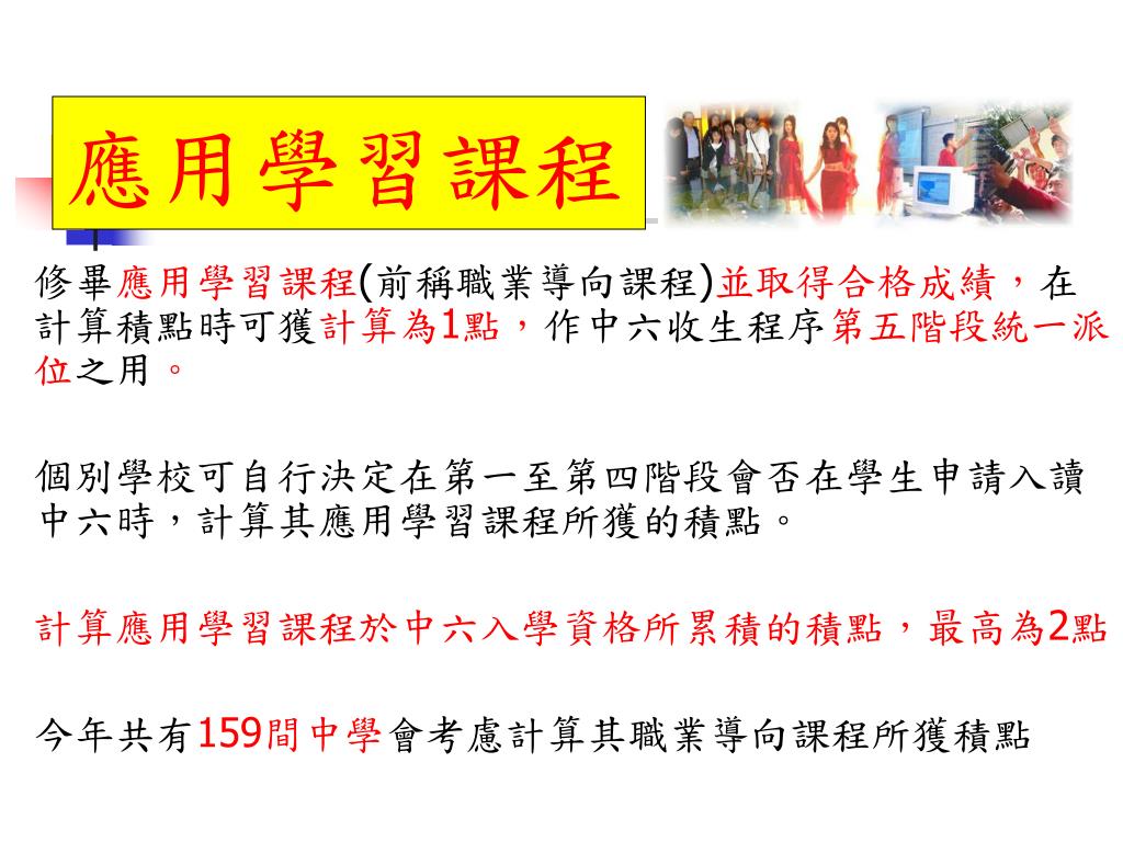 應用學習課程 修畢應用學習課程(前稱職業導向課程)並取得合格成績,在計算積點時可獲計算為1點,作中六收生程序第五階段統一派位之用。 個別學校可自行決定在第一至第四階段會否在學生申請入讀中六時,計算其應用學習課程所獲的積點。 計算應用學習課程於中六入學資格所累積的積點,最高為2點。 今年共有159間中學會考慮計算其職業導向課程所獲積點