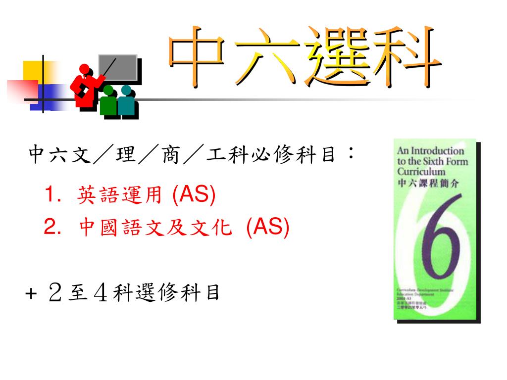 中六文/理/商/工科必修科目: 1. 英語運用 (AS) 2. 中國語文及文化 (AS) + 2至4科選修科目 中六選科