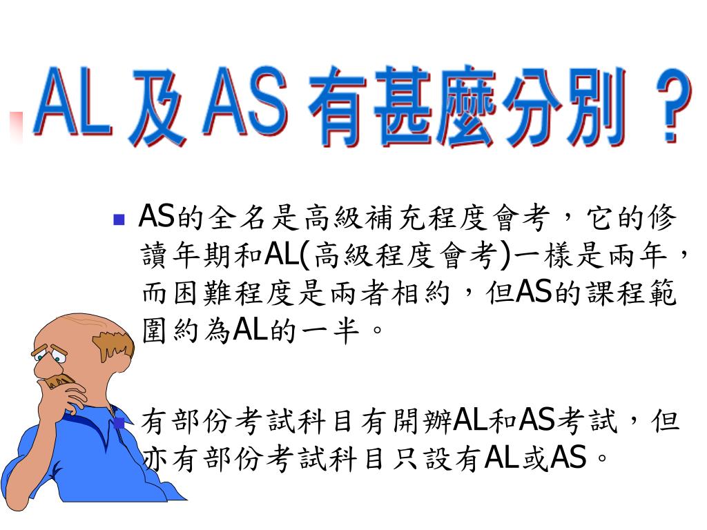 AS的全名是高級補充程度會考,它的修讀年期和AL(高級程度會考)一樣是兩年,而困難程度是兩者相約,但AS的課程範圍約為AL的一半。AS的全名是高級補充程度會考,它的修讀年期和AL(高級程度會考)一樣是兩年,而困難程度是兩者相約,但AS的課程範圍約為AL的一半。 有部份考試科目有開辦AL和AS考試,但亦有部份考試科目只設有AL或AS。