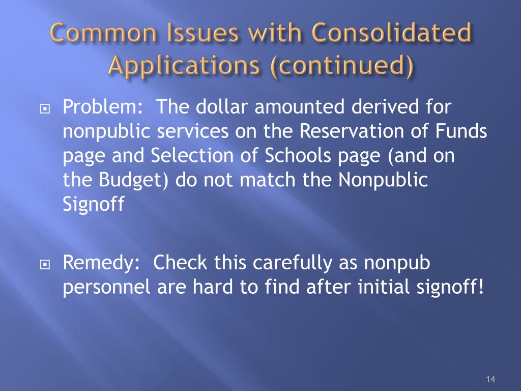 Common Issues with Consolidated Applications (continued) • Problem: The dollar amounted derived for nonpublic services on the Reservation of Funds page and Selection of Schools page (and on the Budget) do not match the Nonpublic Signoff • Remedy: Check this carefully as nonpub personnel are hard to find after initial signoff!