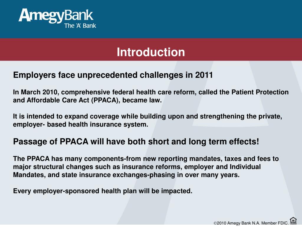 Employers face unprecedented challenges in 2011 In March 2010, comprehensive federal health care reform, called the Patient Protection and Affordable Care Act (PPACA), became law. It is intended to expand coverage while building upon and strengthening the private, employer- based health insurance system. Passage of PPACA will have both short and long term effects! The PPACA has many components-from new reporting mandates, taxes and fees to major structural changes such as insurance reforms, employer and Individual Mandates, and state insurance exchanges-phasing in over many years. Every employer-sponsored health plan will be impacted. Introduction 2010 Amegy Bank N.A. Member FDIC.