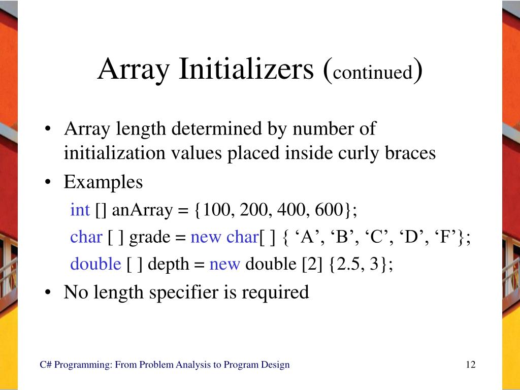 Array Initializers (continued) • Array length determined by number of initialization values placed inside curly braces • Examples int [] anArray = {100, 200, 400, 600}; char [ ] grade = newchar[ ] { ‘A’, ‘B’, ‘C’, ‘D’, ‘F’}; double [ ] depth = new double [2] {2.5, 3}; • No length specifier is required C# Programming: From Problem Analysis to Program Design