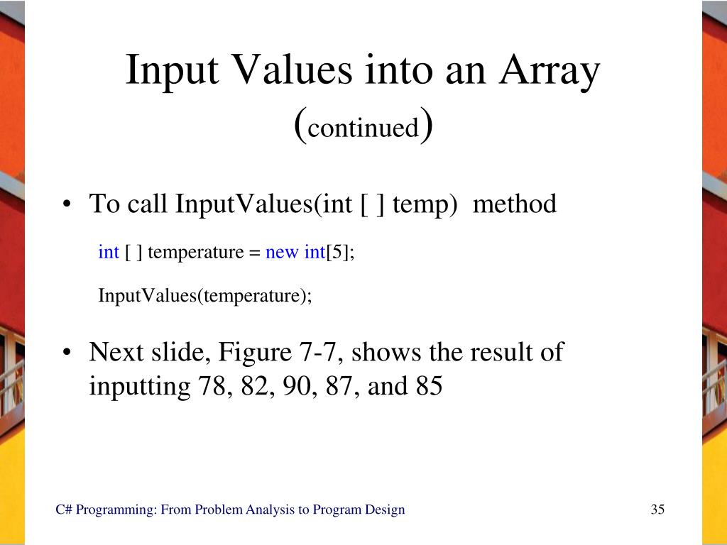 Input Values into an Array (continued) • To call InputValues(int [ ] temp) method int [ ] temperature = newint[5]; InputValues(temperature); • Next slide, Figure 7-7, shows the result of inputting 78, 82, 90, 87, and 85 C# Programming: From Problem Analysis to Program Design