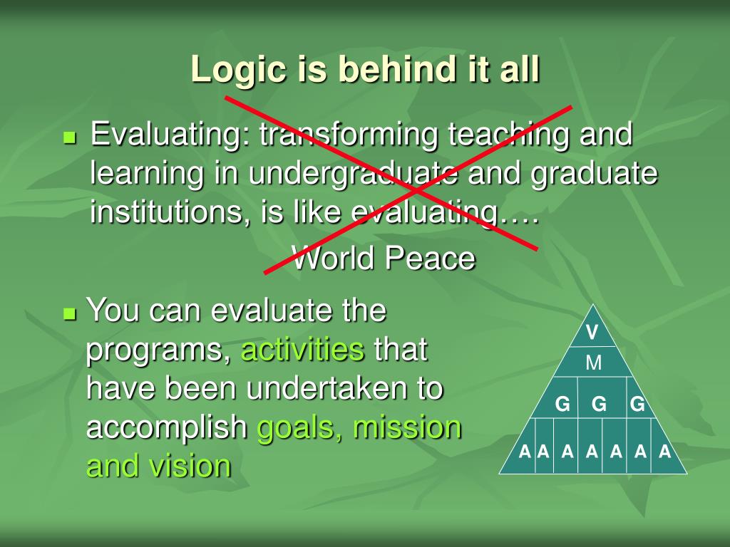 V M G G G A A A A A A A Logic is behind it all • Evaluating: transforming teaching and learning in undergraduate and graduate institutions, is like evaluating…. World Peace • You can evaluate the programs, activities that have been undertaken to accomplish goals, mission and vision