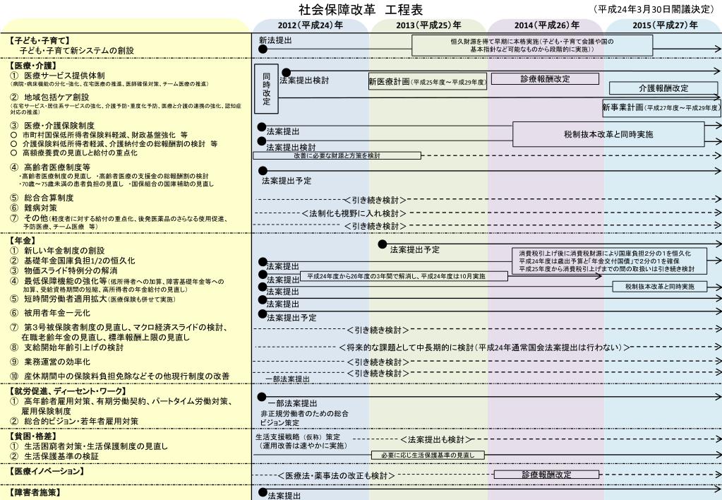 (平成24年3月30日閣議決定) 社会保障改革 工程表 新法提出 恒久財源を得て早期に本格実施(子ども・子育て会議や国の 基本指針など可能なものから段階的に実施)) ● ● 同時改定 法案提出検討 新医療計画(平成25年度~平成29年度) 診療報酬改定 介護報酬改定 新事業計画(平成27年度~平成29年度) ● 税制抜本改革と同時実施 法案提出 ● 法案提出検討 改善に必要な財源と方策を検討 ● 法案提出予定 <引き続き検討> <法制化も視野に入れ検討> <引き続き検討> ● 法案提出予定 消費税引上げ後に消費税財源により国庫負担2分の1を恒久化 平成24年度は歳出予算と「年金交付国債」で2分の1を確保 平成25年度から消費税引上げまでの間の取扱いは引き続き検討 ● 法案提出 ● 平成24年度から26年度の3年間で解消し、平成24年度は10月実施 法案提出 ● 税制抜本改革と同時実施 法案提出 ● 法案提出 ● 法案提出予定 <引き続き検討> <将来的な課題として中長期的に検討(平成24年通常国会法案提出は行わない)> <引き続き検討> <引き続き検討> 一部法案提出 ● 一部法案提出 非正規労働者のための総合 ビジョン策定 生活支援戦略(仮称)策定 (運用改善は速やかに実施) <法案提出も検討> 必要に応じ生活保護基準の見直し 診療報酬改定 <医療法・薬事法の改正も検討> ● 法案提出