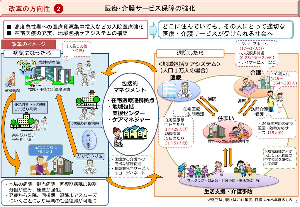 医療・介護サービス保障の強化 改革の方向性 2 ■ 高度急性期への医療資源集中投入などの入院医療強化 ■ 在宅医療の充実、地域包括ケアシステムの構築 どこに住んでいても、その人にとって適切な医療・介護サービスが受けられる社会へ 改革のイメージ ・グループホーム (17→37人分) ・小規模多機能 (0.25か所→2か所) ・デイサービス など (人員1.6倍 ~2倍) 退院したら 病気になったら <地域包括ケアシステム> (人口1万人の場合) 急性期病院 包括的 マネジメント ・介護人材(219→ 364~383人) 介護 医療 ・在宅医療連携拠点 ・地域包括 支援センター ・ケアマネジャー 救急・手術など高度医療 早期退院 通院 通所 亜急性期・回復期リハビリ病院 在宅医療 ・訪問看護 訪問介護 ・看護 日常の医療 ・在宅医療等 (1日当たり 17→29人分) ・訪問看護 (1日当たり 31→51人分) ・24時間対応の定期巡回・随時対応サービス(15人分) 地域の連携病院 住まい 集中リハビリ →早期回復 自宅・ケア付き高齢者住宅 元気でうちに 帰れたよ ※地域包括ケアは、人口1万人程度の中学校区を単位として想定 かかりつけ医 ・医療から介護への 円滑な移行促進 ・相談業務やサービス のコーディネート 老人クラブ・自治会・介護予防・生活支援 等 ・地域の病院、拠点病院、回復期病院の役割 分担が進み、連携が強化。 ・発症から入院、回復期、退院までスムーズ にいくことにより早期の社会復帰が可能に 生活支援・介護予防 ※数字は、現状は2012年度、目標は2025年度のもの