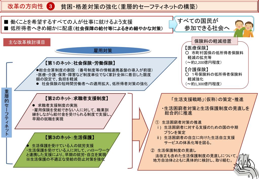 貧困・格差対策の強化(重層的セーフティネットの構築)貧困・格差対策の強化(重層的セーフティネットの構築) 改革の方向性 3 ■ 働くことを希望するすべての人が仕事に就けるよう支援 ■ 低所得者へきめ細かに配慮(社会保障の給付等によるきめ細やかな対策) すべての国民が参加できる社会へ 保険料の軽減措置 主な改革検討項目 【医療保険】 ○ 市町村国保の低所得者保険料 軽減の拡充等 (~約2,200億円程度) 【介護保険】 ○ 1号保険料の低所得者保険料 軽減強化 (~約1,300億円程度) 雇用対策 【第1のネット:社会保険・労働保険】 • 総合合算制度の創設(番号制度等の情報連携基盤の導入が前提) • ・医療・介護・保育・障害など制度単位でなく家計全体に着目した限度額の設定で、負担を軽減 • 社会保険の短時間労働者への適用拡大、低所得者対策の強化 重層的セーフティネット 【第2のネット:求職者支援制度】 • 求職者支援制度の実施 • ・雇用保険を受給できない人に対して、職業訓練をしながら給付金を受けられる制度で支援し、 早期の就職を実現 「生活支援戦略」(仮称)の策定・推進 ・生活困窮者対策と生活保護制度の見直しを 総合的に推進 ① 生活困窮者対策の推進 ⅰ) 生活困窮者に対する支援のための国の中期 プランを策定 ⅱ) 生活困窮者の自立に向けた生活自立支援 サービスの体系化等を図る。 【第3のネット:生活保護】 • 生活保護を受けている人の就労支援 • ・生活保護を受けている人に対して、ハローワークと連携した支援により、早期の就労・自立を実現 • ※生活保護の不適正な受給の防止対策を強化 ② 生活保護制度の見直し 法改正も含めた生活保護制度の見直しについて、地方自治体とともに具体的に検討し、取り組む。 6
