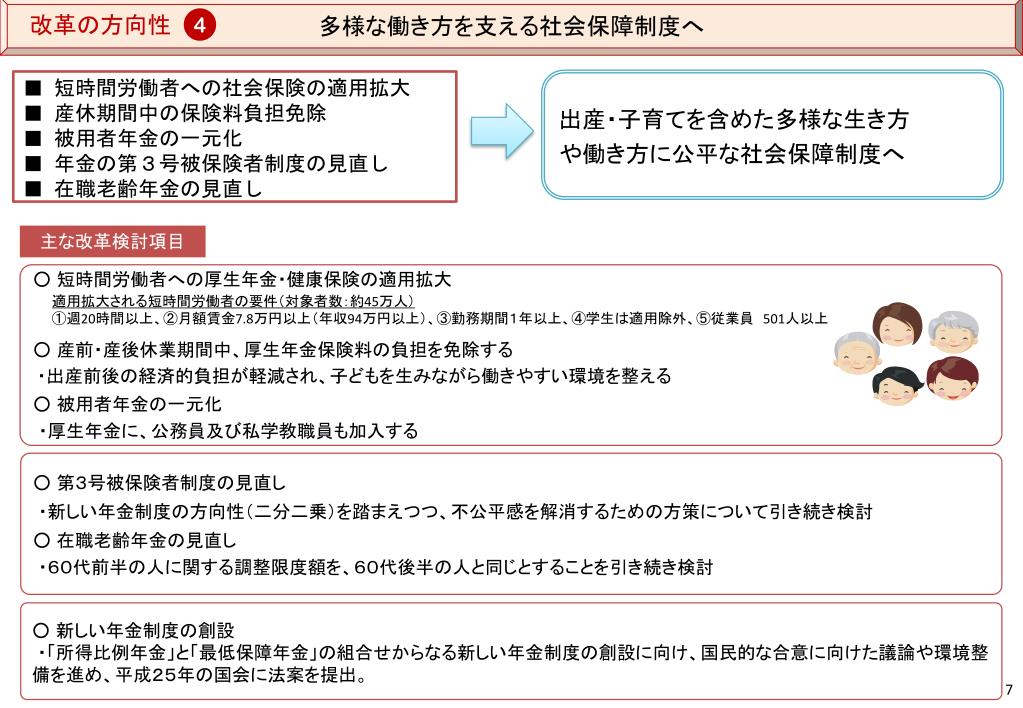 多様な働き方を支える社会保障制度へ 改革の方向性 4 ■ 短時間労働者への社会保険の適用拡大 ■ 産休期間中の保険料負担免除 ■ 被用者年金の一元化 ■ 年金の第3号被保険者制度の見直し ■ 在職老齢年金の見直し 出産・子育てを含めた多様な生き方 や働き方に公平な社会保障制度へ 主な改革検討項目 ○ 短時間労働者への厚生年金・健康保険の適用拡大 適用拡大される短時間労働者の要件(対象者数:約45万人) ①週20時間以上、②月額賃金7.8万円以上(年収94万円以上)、③勤務期間1年以上、④学生は適用除外、⑤従業員 501人以上 ○ 産前・産後休業期間中、厚生年金保険料の負担を免除する ・出産前後の経済的負担が軽減され、子どもを生みながら働きやすい環境を整える ○ 被用者年金の一元化 ・厚生年金に、公務員及び私学教職員も加入する ○ 第3号被保険者制度の見直し ・新しい年金制度の方向性(二分二乗)を踏まえつつ、不公平感を解消するための方策について引き続き検討 ○ 在職老齢年金の見直し ・60代前半の人に関する調整限度額を、60代後半の人と同じとすることを引き続き検討 ○ 新しい年金制度の創設 ・「所得比例年金」と「最低保障年金」の組合せからなる新しい年金制度の創設に向け、国民的な合意に向けた議論や環境整備を進め、平成25年の国会に法案を提出。