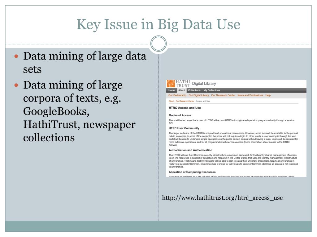 Key Issue in Big Data Use http://www.hathitrust.org/htrc_access_use Data mining of large data sets Data mining of large corpora of texts, e.g. GoogleBooks, HathiTrust, newspaper collections
