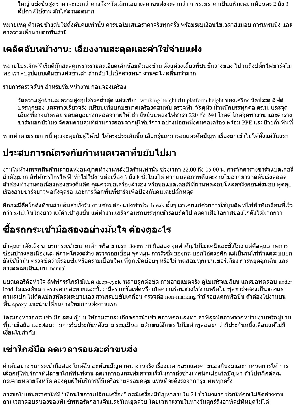 ใหญ่แข่งขันสูงราคาจะนุ่มกว่าต่างจังหวัดเล็กน้อยแต่ค่าขนส่งจะตํ?ากว่าการรวมราคาเป็นแพ็กเหมาเดือนละ 2 ถึง 3 สัปดาห์ใช้งานมักได้ส่วนลดมาก หมายเหตุตัวเลขข้างต้นใช้ตั?งต้นคุยเท่านั?นควรขอใบเสนอราคาจริงทุกครั?งพร้อมระบุเงื?อนไขเวลาส่งมอบการเทรนนิ?งและ ค่าความเสียหายต่อพื?นถ้ามี เคล็ดลับหน้างาน: เลี?ยงงานสะดุดและค่าใช้จ่ายแฝง หลายโปรเจ็กต์ที?เริ?มดีมักสะดุดเพราะรายละเอียดเล็กน้อยที?มองข้ามตั?งแต่วงเลี?ยวที?ชนชั?นวางของไปจนถึงปลั?กไฟชาร์จไม่ พอเราพบรูปแบบเดิมซํ?าแล้วซํ?าเล่าถ้ากลับไปเช็คล่วงหน้างานจะไหลลื?นกว่ามาก รายการตรวจสั?นๆสําหรับทีมหน้างานก่อนจองเครื?อง วัดความสูงฝ้าและความสูงอุปสรรคตํ?าสุดแล้วเทียบ working height กับ platform height ของเครื?องวัดประตูลิฟต์ บรรทุกของและทางเลี?ยวจริงเปรียบเทียบกับขนาดเครื?องตอนพับตรวจพื?นวัสดุผิวนํ?าหนักบรรทุกต่อตร.ม. และจุด เสี?ยงที?อาจเกิดรอยขอข้อมูลแรงกดล้อจากผู้ให้เช่ายืนยันแหล่งไฟชาร์จ 220 ถึง 240 โวลต์ใกล้จุดทํางานและตาราง ชาร์จนอกชั?วโมงจัดคนควบคุมที?ผ่านการสอนจากผู้ให้บริการอย่างน้อยหนึ?งคนต่อเครื?องพร้อม PPE และป้ายกั?นพื?นที? หากทําตามรายการนี?คุณจะคุยกับผู้ให้เช่าได้ตรงประเด็นขึ?นเลือกรุ่นเหมาะสมและตัดปัญหาเรื?องยกเข้าไม่ได้ตั?งแต่วันแรก ประสบการณ์ตรงกับกําหนดเวลาที?ขยับไปมา งานในห้างสรรพสินค้าหลายแห่งอนุญาตทํางานหลังปิดร้านเท่านั?นช่วงเวลา 22.00 ถึง 05.00 น. การจัดตารางชาร์จแบตเตอรี? สําคัญมากลิฟท์กรรไกรไฟฟ้าทั?วไปใช้งานต่อเนื?อง 6 ถึง 8 ชั?วโมงได้หากแบตสภาพดีและงานไม่ลากยาวกดคันเร่งตลอด ถ้าต้องทํางานต่อเนื?องสองช่วงคืนติดคุณควรขอเครื?องสํารองหรือขอแบตเตอร์รี?ที?ผ่านทดสอบโหลดจริงก่อนส่งมอบพูดคุย เรื?องสายชาร์จยาวพอถึงจุดรอและการล็อกพื?นที?ชาร์จเพื?อป้องกันคนเตะปลั?กหลุด อีกกรณีคือโกดังที?ขนถ่ายสินค้าทั?งวันงานซ่อมต้องแบ่งทําช่วง break สั?นๆเราเคยแก้ด้วยการใช้บูมลิฟท์ไฟฟ้าที?เคลื?อนที?เร็ว กว่า x-lift ในโถงยาวแม้ค่าเช่าสูงขึ?นแต่ทํางานเสร็จก่อนรถบรรทุกเข้ารอบถัดไปลดค่าเสียโอกาสของโกดังได้มากกว่า ซื?อรถกระเช้ามือสองอย่างมั?นใจต้องดูอะไร ถ้าคุณกําลังเล็งขายรถกระเช้าขนาดเล็กหรือขายรถ Boom lift มือสองจุดสําคัญไม่ใช่แค่ปีและชั?วโมงแต่คือคุณภาพการ ซ่อมบํารุงต่อเนื?องและสภาพโครงสร้างตรวจรอยเชื?อมจุดหมุนการรั?วซึมของกระบอกไฮดรอลิกแม้เป็นรุ่นไฟฟ้าแต่ระบบยก ยังใช้นํ?ามันตรวจซีลว่ามีรอยซึมหรือคราบเปื?อนใหม่ที?ถูกเช็ดบ่อยๆหรือไม่ทดสอบทุกเซนเซอร์เฉียงการหยุดฉุกเฉินแล