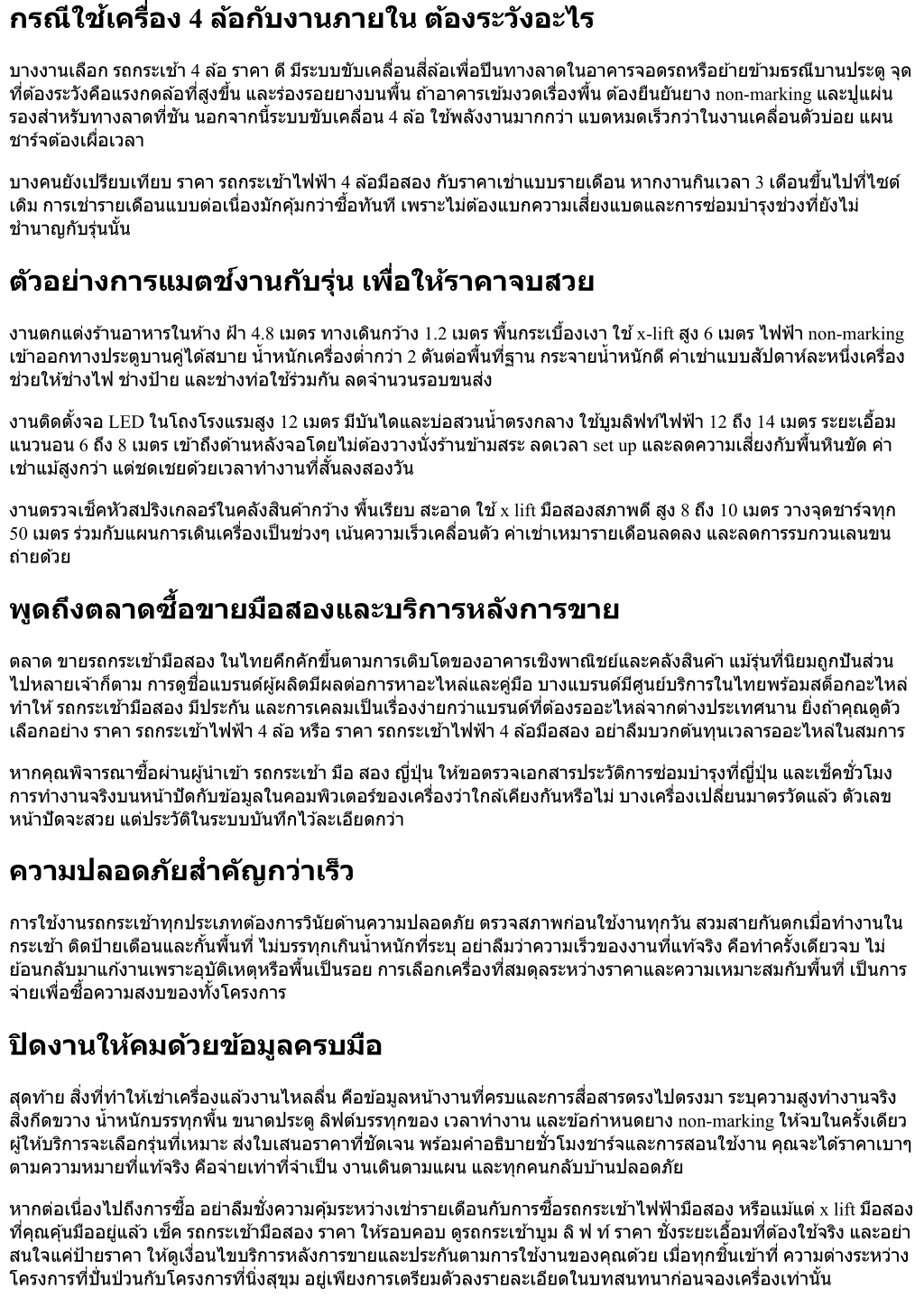 งานติดตั?งไฟในห้างงานเซ็ตอัพโชว์รูมงานซ่อมบํารุงในโรงงานที?คุมฝุ่นเข้มหรือแม้แต่การล้างกระจกในอาคารสํานักงานที?งานติดตั?งไฟในห้างงานเซ็ตอัพโชว์รูมงานซ่อมบํารุงในโรงงานที?คุมฝุ่นเข้มหรือแม้แต่การล้างกระจกในอาคารสํานักงานที? ต้องทํา out-of-hours ทั?งหมดนี?มีโจทย์ร่วมกันอยู่สองข้อคือความปลอดภัยกับการรบกวนพื?นที?ให้น้อยที?สุดรถกระเช้าไฟฟ้า ขนาดเล็กจึงกลายเป็นตัวเลือกที?ทีม facility, contractor และผู้รับเหมางานตกแต่งเชื?อใจเพราะทํางานเงียบไม่มีไอเสียและ คล่องตัวในช่องทางเดินแคบรวมถึงลิฟต์บรรทุกของหลายครั?งเช่าหนึ?งวันแล้วงานจบเร็วกว่าใช้โครงนั?งร้านหลายช่วงชั?วโมง ความต่างตรงนี?สะท้อนต้นทุนรวมที?ดีขึ?นอย่างเห็นภาพ บทความนี?สรุปภาพรวมประเภทเครื?องที?ใช้บ่อยข้อดีข้อจํากัดการใช้งานจริงเกณฑ์คัดเลือกรุ่นให้เหมาะกับงานภายในรวม ถึงไกด์ราคาเช่าแบบที?คนทําหน้างานใช้คุยกับบัญชีได้และหากคุณกําลังชั?งใจระหว่างเช่ากับซื?อรถกระเช้ามือสองเราแทรก มุมเปรียบเทียบพร้อมแนวทางเช็คสภาพและคําถามที?ควรถามผู้ให้บริการโดยไม่ยัดเยียดศัพท์เทคนิคเกินจําเป็น ทําไมรถกระเช้าไฟฟ ้ าขนาดเล็กถึงตอบโจทย์งานภายใน รถกระเช้าไฟฟ้าขนาดเล็กสะท้อนคําว่าสมดุลได้ดีช่วงยกพอเหมาะกับงาน ceiling สูง 6 ถึง 12 เมตรใช้แบตเตอรี?จึงทํางาน เงียบและไม่มีควันนํ?าหนักตัวของหลายรุ่นถูกออกแบบให้ผ่านพื?นอาคารเชิงพาณิชย์ที?จํากัดนํ?าหนักบรรทุกต่อตารางเมตร ช่วงล้อแคบพับบูมและราวกั?นได้ทําให้เข้าในประตูบานคู่มาตรฐาน 90 ถึง 100 เซนติเมตรได้สบายเครื?องกลุ่มนี?เข้าถึงงาน หลายประเภทตั?งแต่ติดตั?งไฟป้ายปรับหัวสปริงเกลอร์ติดตั?งกล้องและงานเดินดักท์เบาในโถง หากเทียบกับนั?งร้านเครื?องช่วยลดการย้ายฐานที?กินแรงและเวลามากเช่ารถขากรรไกรนอกจากนี?ยังปลอดภัยกว่าในงานที? ต้องเปลี?ยนตําแหน่งบ่อยเพราะผู้ปฏิบัติงานอยู่ในตะกร้าที?มีราวกันตกปุ่มหยุดฉุกเฉินและระบบ interlock ป้องกันการยกใน สภาพพื?นเอียงเกินค่ากําหนดจุดที?ต้องเข้าใจคือรถกระเช้าไฟฟ้าทํางานบนพื?นเรียบดีที?สุดหากพื?นไม่เรียบหรือเอียงมาก บางรุ่นจะไม่ยอมยกเพื?อความปลอดภัย เลือกรถแบบไหนดีเมื?อต้องทํางานภายในอาคาร ภาพใหญ่แบ่งเป็นสองตระกูลที?คนหน้างานจดจําได้ง่ายคือแบบกรรไกรหรือ x-lift และแบบบูมลิฟท์ทั?งสองใช้มอเตอร์ ไฟฟ้าแต่การยกและการเคลื?อนที?ไม่เหมือนกันงานภายในส่วนใหญ่จบด้วย x-lift มือสองหรือเครื?องเช่าใหม่สภาพดีเพราะ ปลอดภัยตรงไปตรงมาแต่อีกหลายงานต้องการเอื?อมออกด้านข้างบูมลิฟท์ไฟฟ้าจึงเข้าทําแทนบันไดแ