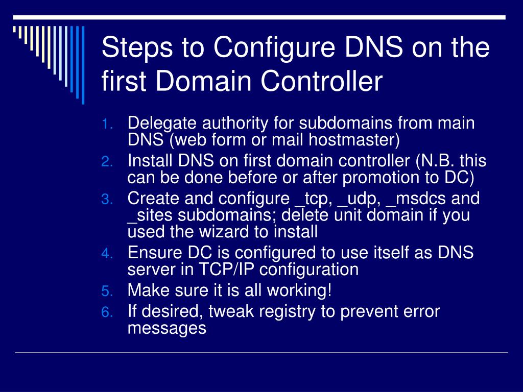 Steps to Configure DNS on the first Domain Controller • Delegate authority for subdomains from main DNS (web form or mail hostmaster) • Install DNS on first domain controller (N.B. this can be done before or after promotion to DC) • Create and configure _tcp, _udp, _msdcs and _sites subdomains; delete unit domain if you used the wizard to install • Ensure DC is configured to use itself as DNS server in TCP/IP configuration • Make sure it is all working! • If desired, tweak registry to prevent error messages