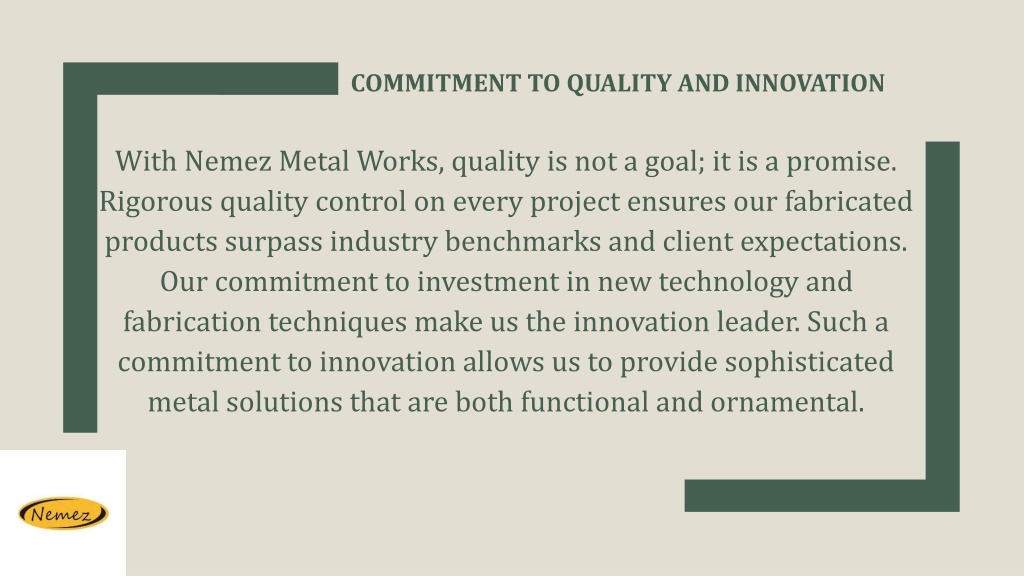 Commitment to Quality and Innovation With Nemez Metal Works, quality is not a goal; it is a promise. Rigorous quality control on every project ensures our fabricated products surpass industry benchmarks and client expectations. Our commitment to investment in new technology and fabrication techniques make us the innovation leader. Such a commitment to innovation allows us to provide sophisticated metal solutions that are both functional and ornamental.