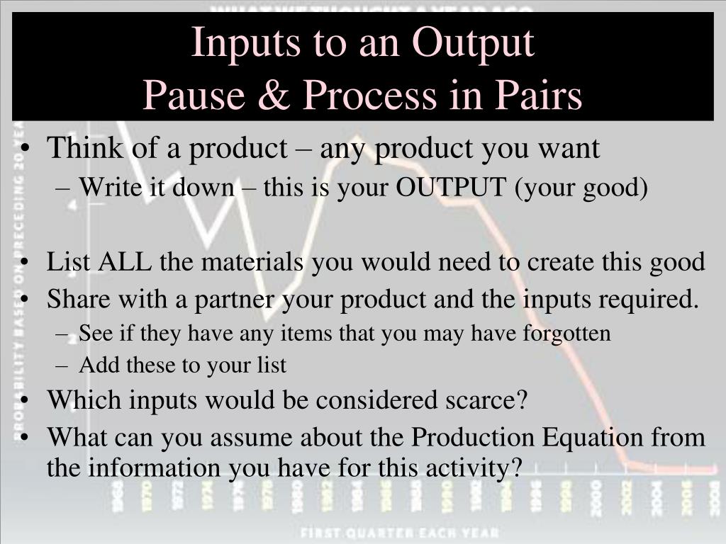 Inputs to an OutputPause & Process in Pairs • Think of a product – any product you want • Write it down – this is your OUTPUT (your good) • List ALL the materials you would need to create this good • Share with a partner your product and the inputs required. • See if they have any items that you may have forgotten • Add these to your list • Which inputs would be considered scarce? • What can you assume about the Production Equation from the information you have for this activity?