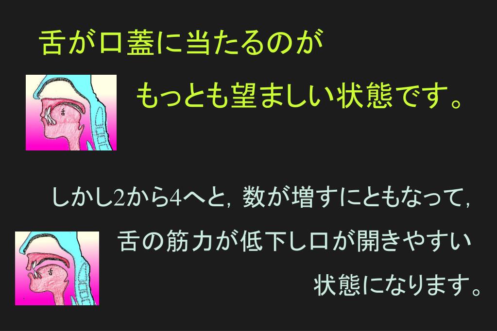 舌が口蓋に当たるのが もっとも望ましい状態です。 しかし2から4へと,数が増すにともなって, 舌の筋力が低下し口が開きやすい 状態になります。