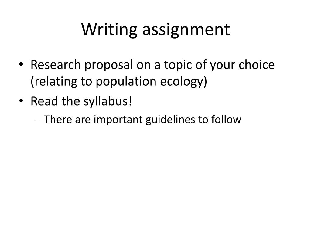 Writing assignment • Research proposal on a topic of your choice (relating to population ecology) • Read the syllabus! • There are important guidelines to follow