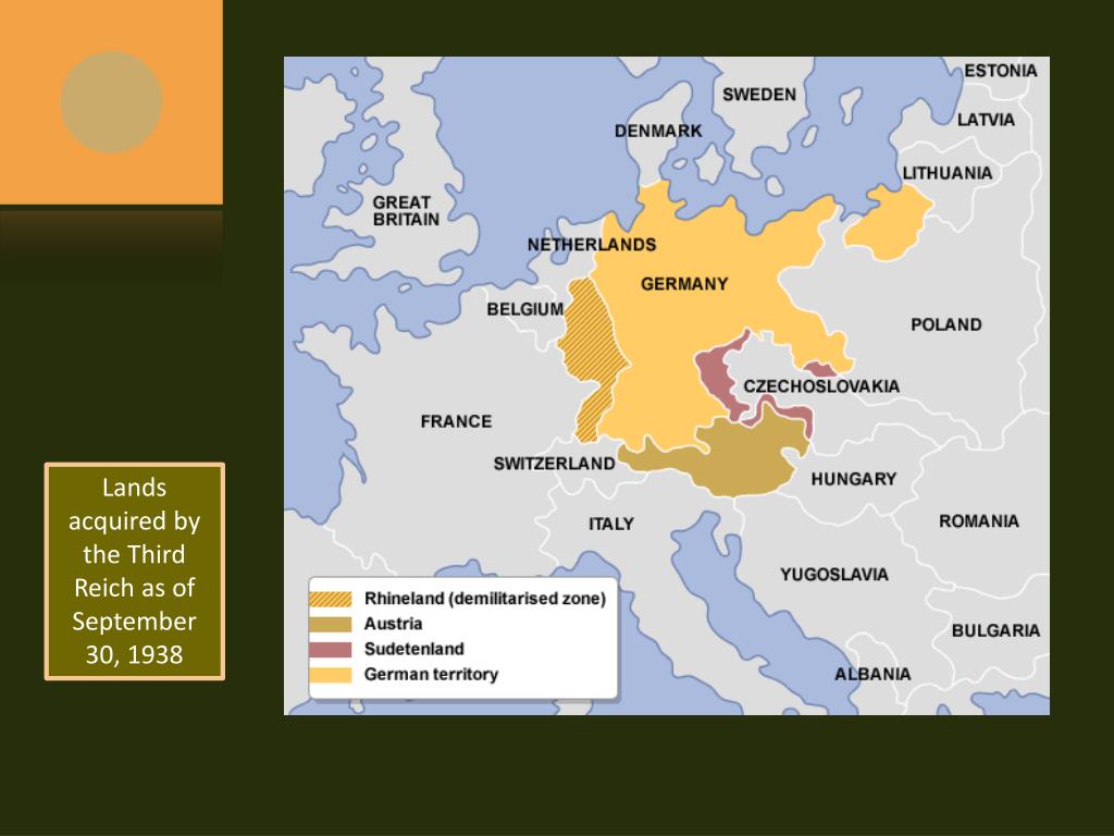 Nazi Aggression • The Third Reich • Hitler vowed to create a German-speaking empire in violation of the Treaty of Versailles • Nazi Violations of the Treaty of Versailles • Hitler begins to rebuild army • Hitler sends troops into the Rhineland in 1936 • Rhineland land in western declared de-militarized under the Treaty of Versailles • Acted as a buffer between France and Germany Nazi soldiers march into the Rhineland to the cheers of Germans
