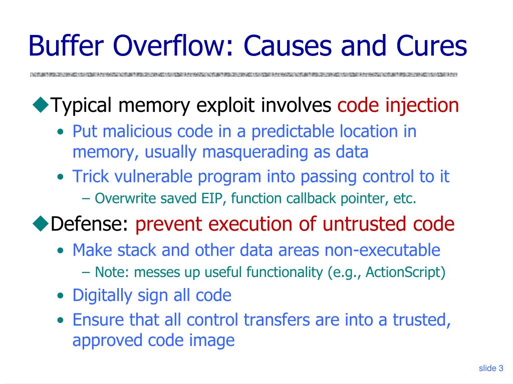 Buffer Overflow: Causes and Cures • Typical memory exploit involves code injection • Put malicious code in a predictable location in memory, usually masquerading as data • Trick vulnerable program into passing control to it • Overwrite saved EIP, function callback pointer, etc. • Defense: prevent execution of untrusted code • Make stack and other data areas non-executable • Note: messes up useful functionality (e.g., ActionScript) • Digitally sign all code • Ensure that all control transfers are into a trusted, approved code image