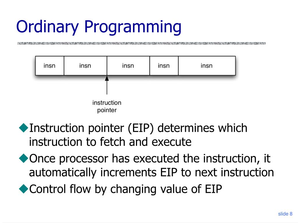 Ordinary Programming Instruction pointer (EIP) determines which instruction to fetch and execute Once processor has executed the instruction, it automatically increments EIP to next instruction Control flow by changing value of EIP