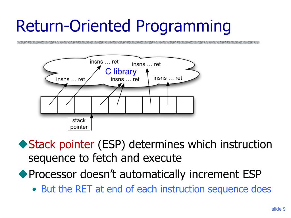 Return-Oriented Programming Stack pointer (ESP) determines which instruction sequence to fetch and execute Processor doesn’t automatically increment ESP • But the RET at end of each instruction sequence does