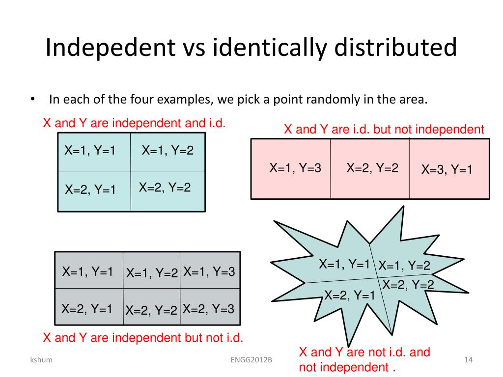 Another example of identically distributed random variables 2 1 Toss two fair coins.Let Y() = 1 if both are heads, and let Y() = 2 otherwise. Pick a random point in a circle of radius 2 Let X() = 1 if the distance from to the centre is less than 1, and X() = 2 if the distance from to the centre is larger than or equal to 1. P(X() = 1) = P(Y() = 1) = 0.25 P(X() = 2) = P(Y() = 2) = 0.75 ENGG2012B