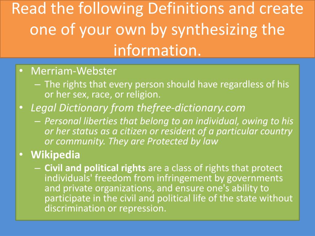 Read the following Definitions and create one of your own by synthesizing the information. • Merriam-Webster • The rights that every person should have regardless of his or her sex, race, or religion. • Legal Dictionary from thefree-dictionary.com • Personal liberties that belong to an individual, owing to his or her status as a citizen or resident of a particular country or community. They are Protected by law • Wikipedia • Civil and political rights are a class of rights that protect individuals' freedom from infringement by governments and private organizations, and ensure one's ability to participate in the civil and political life of the state without discrimination or repression.