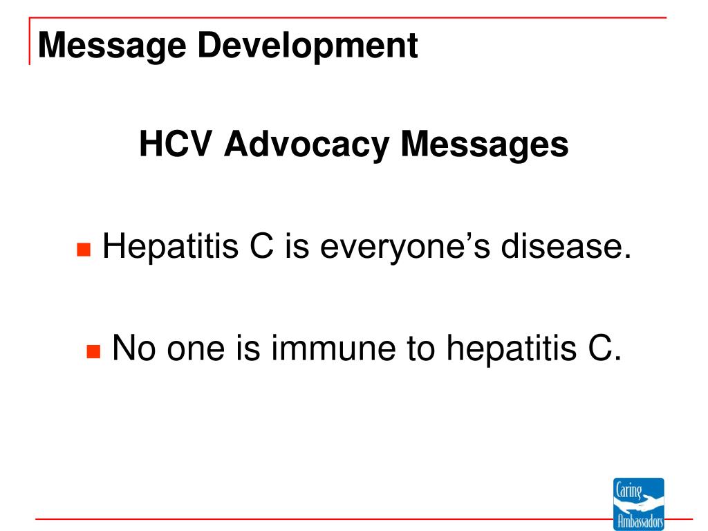 Message Development HCV Advocacy Messages • Hepatitis C is everyone’s disease. • No one is immune to hepatitis C.