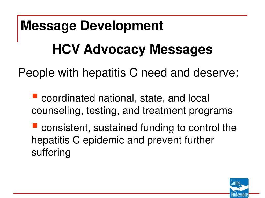 Message Development HCV Advocacy Messages People with hepatitis C need and deserve: coordinated national, state, and local counseling, testing, and treatment programs consistent, sustained funding to control the hepatitis C epidemic and prevent further suffering