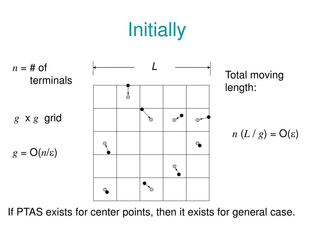 Initially L n = # of terminals Total moving length: g x g grid n (L / g) = O() g = O(n/) If PTAS exists for center points, then it exists for general case.