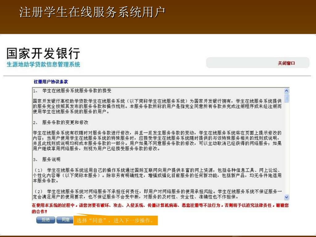 国家开发银行生源地信用助学贷款 学生在线服务系统操作指南. 学生在线服务系统网址 https:// www.csls.cdb.com.cn 2013 年 6 月. 登陆学生在线服务系统. 在 IE 地址栏输入: https://sls.cdb.com.cn 按“回车”( ENTEN )键. 双击“ IE” 浏览器. 若出现此提示,不必理会,点击“ 继续浏览此网站 ”,将登录到学生在线服务系统”登陆注册“界面。. 注册学生在线服务系统用户. 点击“注册”按钮,弹出左侧对话框。.