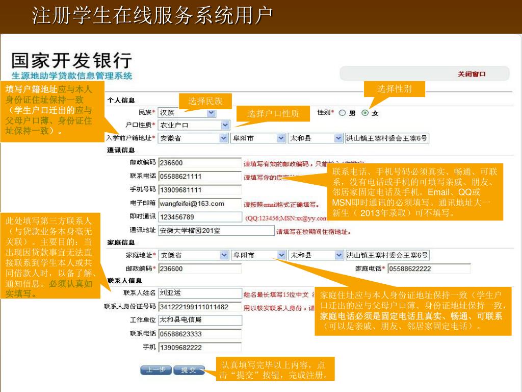 注册学生在线服务系统用户 填写户籍地址应与本人身份证住址保持一致(学生户口迁出的应与父母户口薄、身份证住址保持一致)。 选择性别 选择民族 选择户口性质 联系电话、手机号码必须真实、畅通、可联系,没有电话或手机的可填写亲戚、朋友、邻居家固定电话及手机。Email、QQ或MSN即时通讯的必须填写。通讯地址大一新生( 2013年录取)可不填写。 此处填写第三方联系人(与贷款业务本身毫无关联)。主要目的:当出现因贷款事宜无法直接联系到学生本人或共同借款人时,以备了解、通知信息。必须认真如实填写。 家庭住址应与本人身份证地址保持一致(学生户口迁出的应与父母户口薄、身份证地址保持一致,家庭电话必须是固定电话且真实、畅通、可联系(可以是亲戚、朋友、邻居家固定电话)。 认真填写完毕以上内容,点击“提交”按钮,完成注册。
