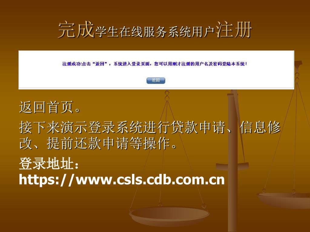 完成学生在线服务系统用户注册 返回首页。 接下来演示登录系统进行贷款申请、信息修改、提前还款申请等操作。 登录地址:https://www.csls.cdb.com.cn