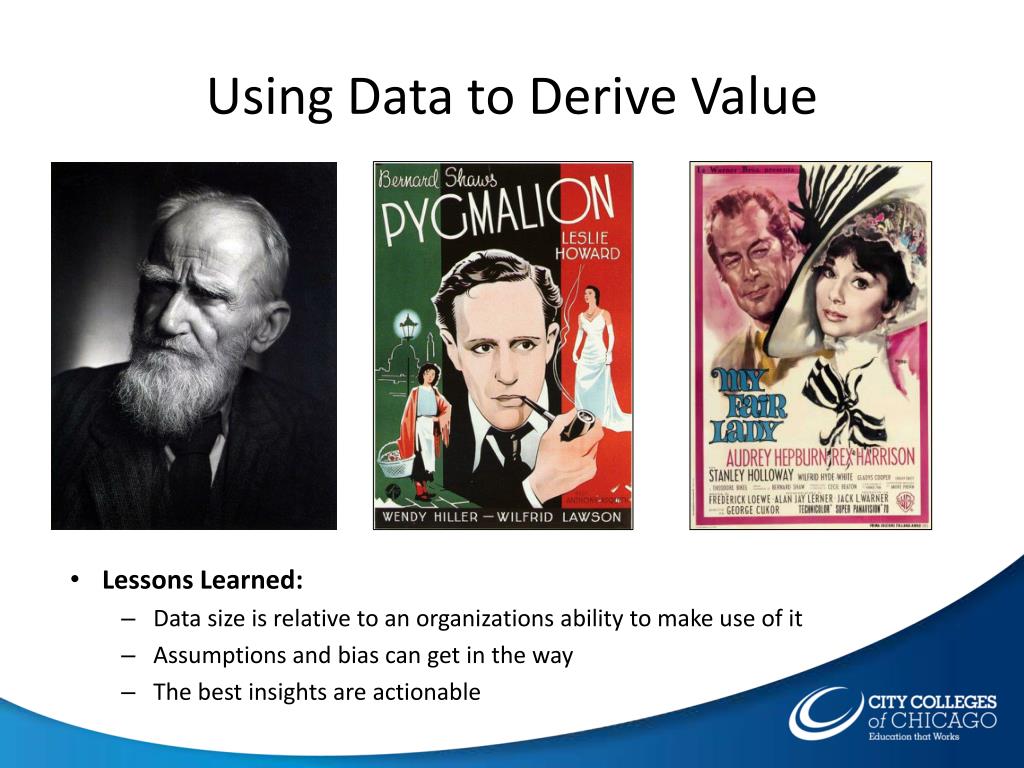 Using Data to Derive Value • Lessons Learned: • Data size is relative to an organizations ability to make use of it • Assumptions and bias can get in the way • The best insights are actionable