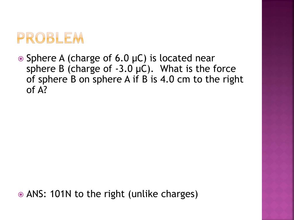 Problem • Sphere A (charge of 6.0 μC) is located near sphere B (charge of -3.0 μC). What is the force of sphere B on sphere A if B is 4.0 cm to the right of A? • ANS: 101N to the right (unlike charges)