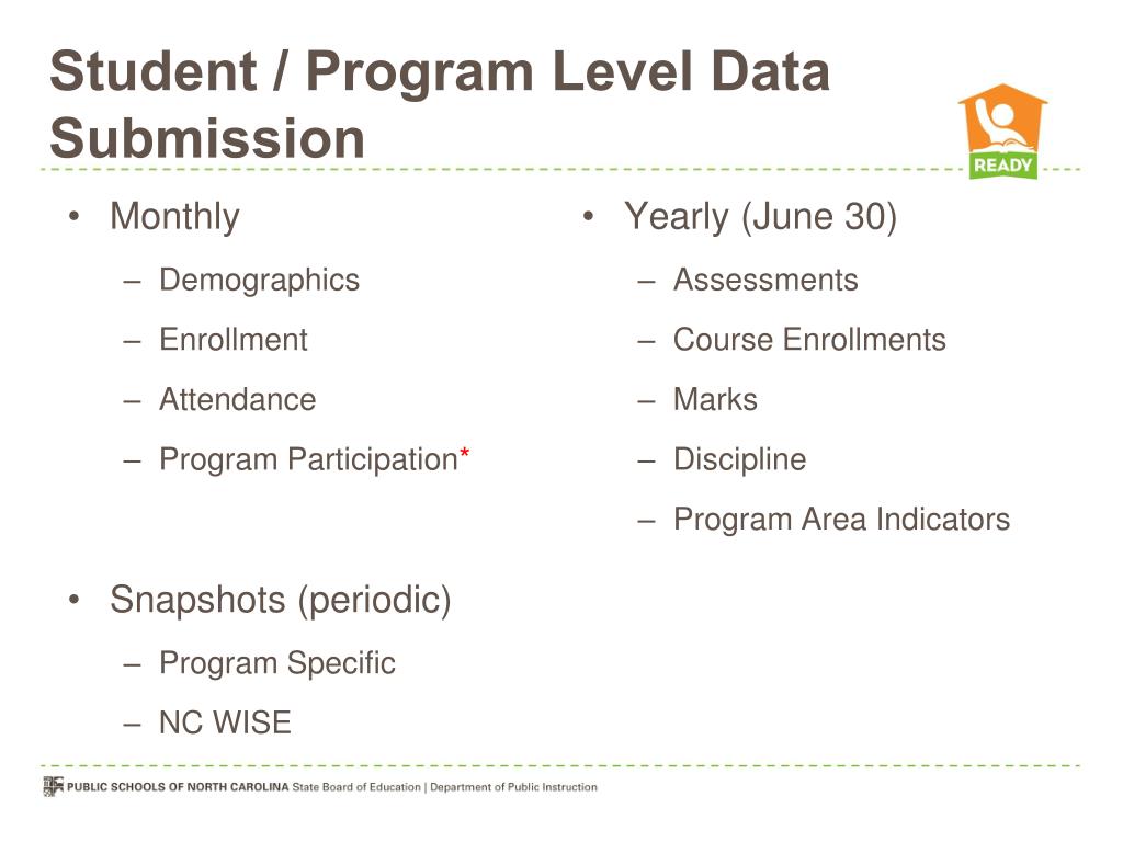 Student / Program Level Data Submission Yearly (June 30) Assessments Course Enrollments Marks Discipline Program Area Indicators • Monthly • Demographics • Enrollment • Attendance • Program Participation* • Snapshots (periodic) • Program Specific • NC WISE