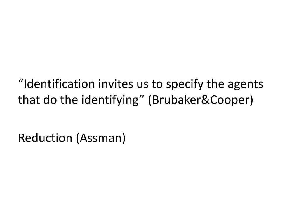 “Identification invites us to specify theagents that do the identifying” (Brubaker&Cooper) Reduction(Assman)