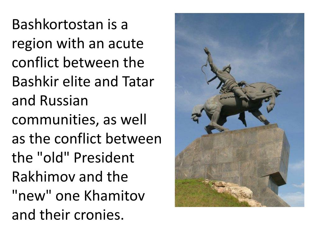 Bashkortostan is a region with an acuteconflict between theBashkir elite and Tatar and Russian communities, as well as the conflict between the "old" President Rakhimov and the "new" one Khamitovandtheircronies.