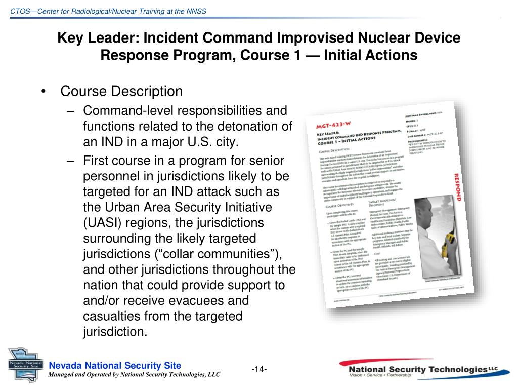 Key Leader: Incident Command Improvised Nuclear Device Response Program, Course 1 — Initial Actions • Course Description • Command-level responsibilities and functions related to the detonation of an IND in a major U.S. city. • First course in a program for senior personnel in jurisdictions likely to be targeted for an IND attack such as the Urban Area Security Initiative (UASI) regions, the jurisdictions surrounding the likely targeted jurisdictions (“collar communities”), and other jurisdictions throughout the nation that could provide support to and/or receive evacuees and casualties from the targeted jurisdiction.