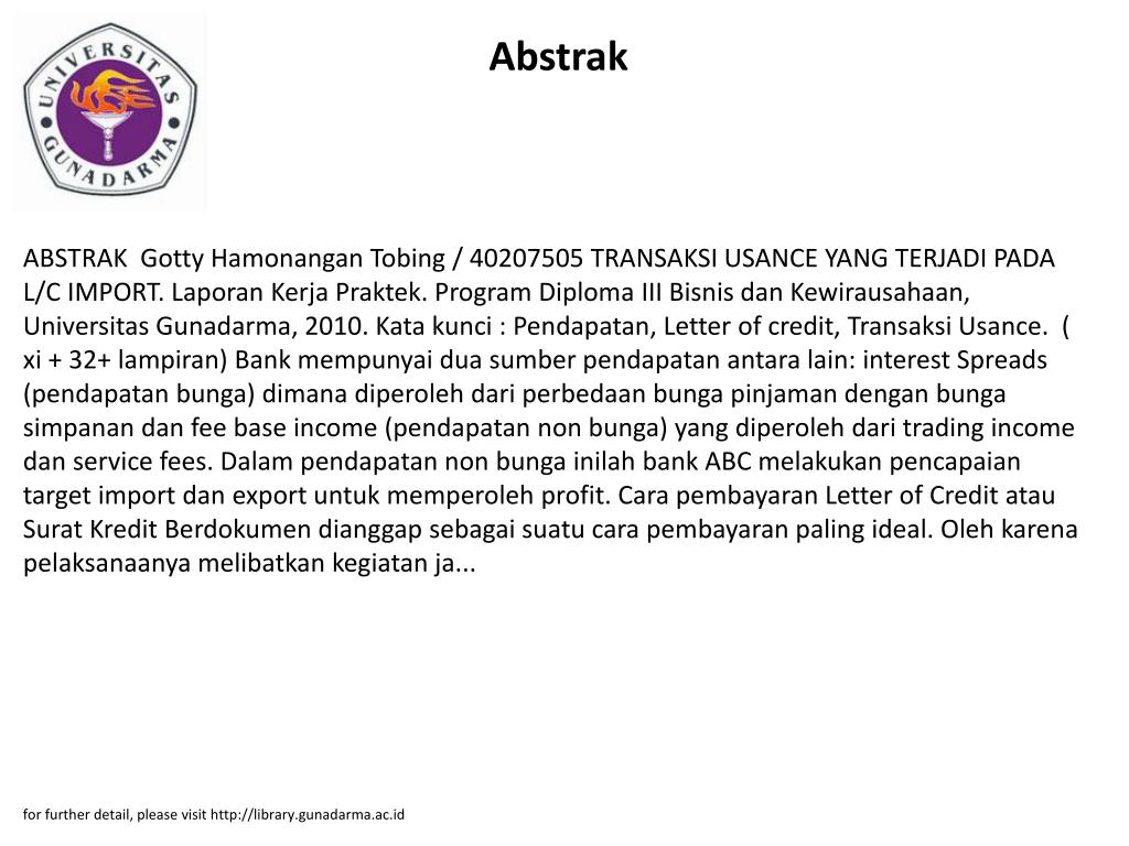 TRANSAKSI USANCE YANG TERJADI PADA L/C IMPORT. Gotty Hamonangan Tobing / 40207505. for further detail, please visit http://library.gunadarma.ac.id. Abstrak.