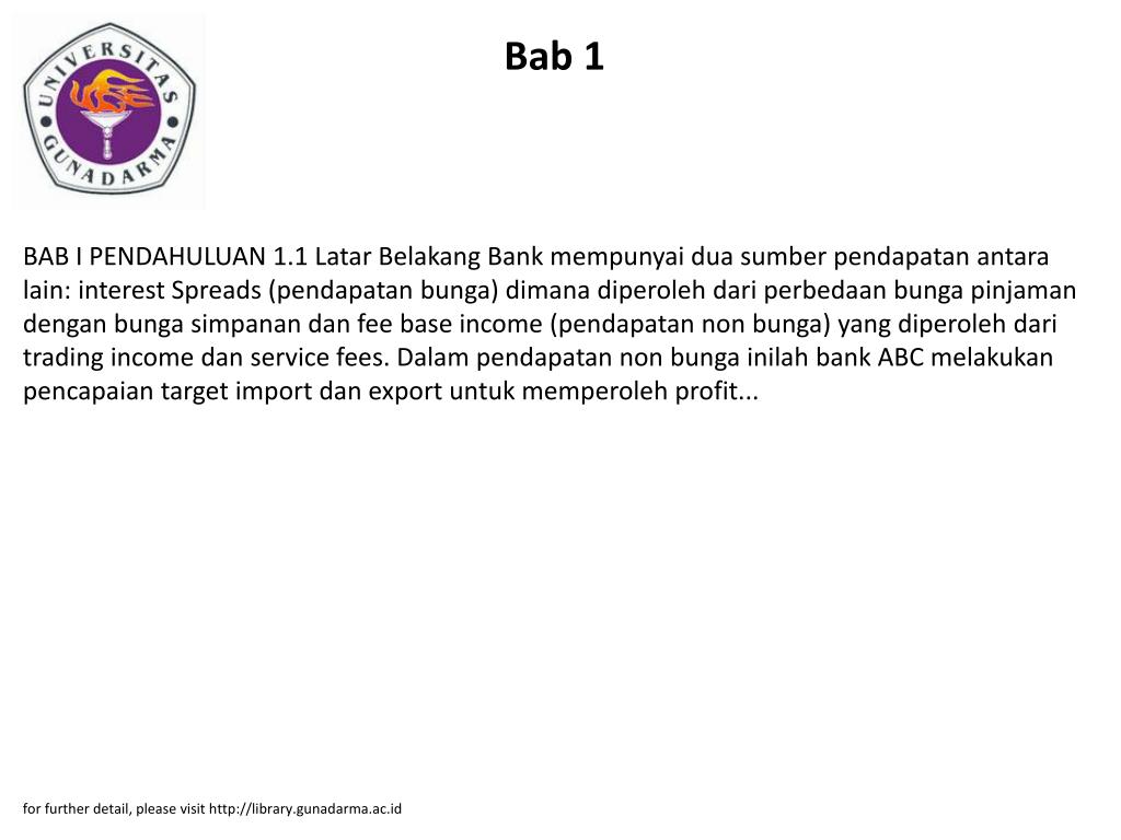 Bab 1 • BAB I PENDAHULUAN 1.1 Latar Belakang Bank mempunyai dua sumber pendapatan antara lain: interest Spreads (pendapatan bunga) dimana diperoleh dari perbedaan bunga pinjaman dengan bunga simpanan dan fee base income (pendapatan non bunga) yang diperoleh dari trading income dan service fees. Dalam pendapatan non bunga inilah bank ABC melakukan pencapaian target import dan export untuk memperoleh profit... • for further detail, please visit http://library.gunadarma.ac.id