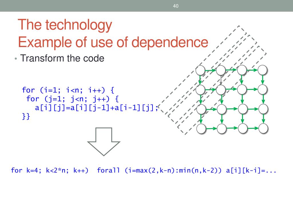 The technologyExample of use of dependence • Compute dependences (part 1) for (i=1; i<n; i++) { for (j=1; j<n; j++) { a[i][j]=a[i][j-1]+a[i-1][j]; }} i=2 i=1 a[1][1] = a[1][0] + a[0][1] a[1][2] = a[1][1] + a[0][2] a[1][3] = a[1][2] + a[0][3] a[1][4] = a[1][3] + a[0][4] a[2][1] = a[2][0] + a[1][1] a[2][2] = a[2][1] + a[1][2] a[2][3] = a[2][2] + a[1][3] a[2][4] = a[2][3] + a[1][4] j=1 j=2 j=3 j=4
