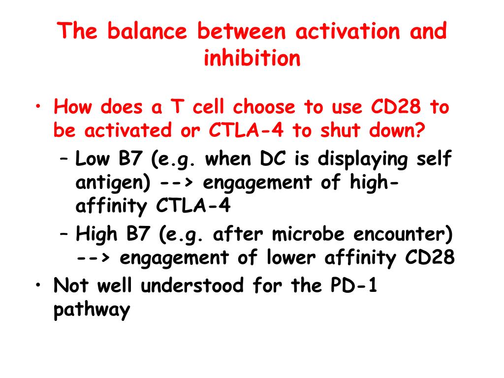 The balance between activation and inhibition • How does a T cell choose to use CD28 to be activated or CTLA-4 to shut down? • Low B7 (e.g. when DC is displaying self antigen) --> engagement of high-affinity CTLA-4 • High B7 (e.g. after microbe encounter) --> engagement of lower affinity CD28 • Not well understood for the PD-1 pathway