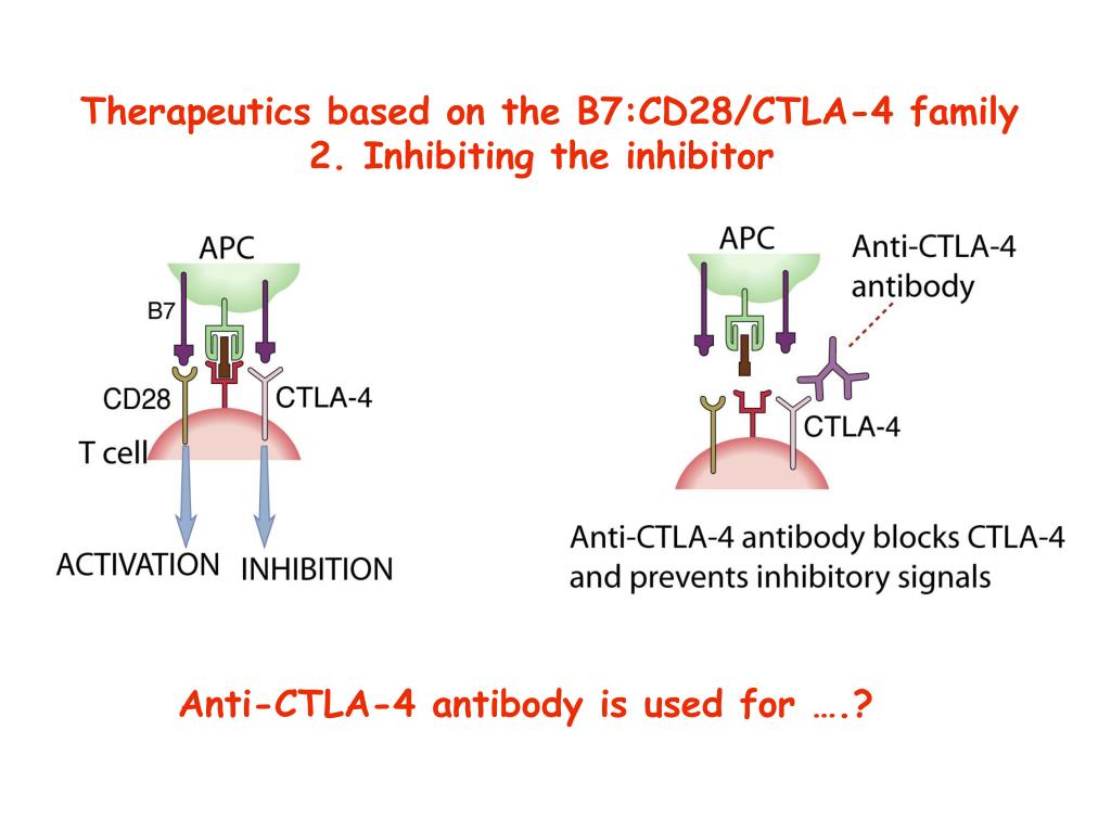 Therapeutics based on the B7:CD28/CTLA-4 family 2. Inhibiting the inhibitor Anti-CTLA-4 antibody is approved for tumor immunotherapy (enhancing immune responses against tumors) Even more impressive early clinical trial results with anti-PD-1 in cancer patients