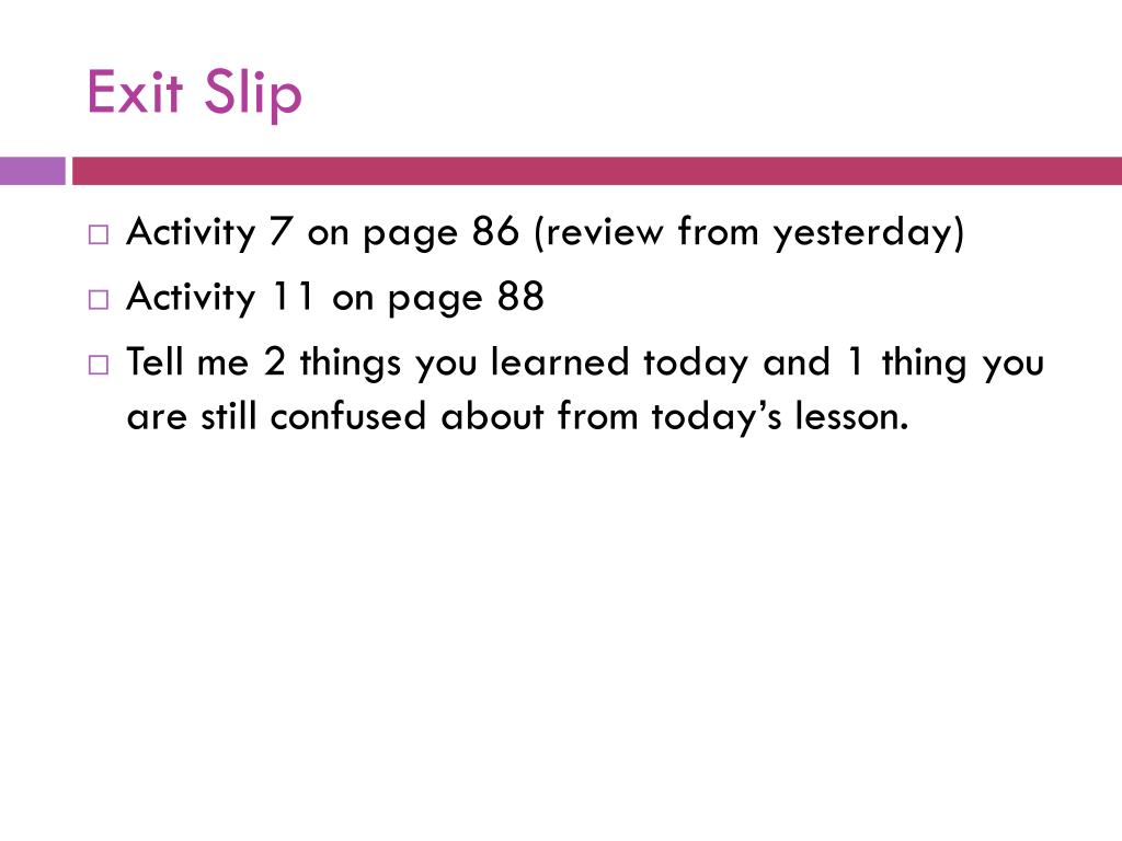 Exit Slip • Activity 7 on page 86 (review from yesterday) • Activity 11 on page 88 • Tell me 2 things you learned today and 1 thing you are still confused about from today’s lesson.